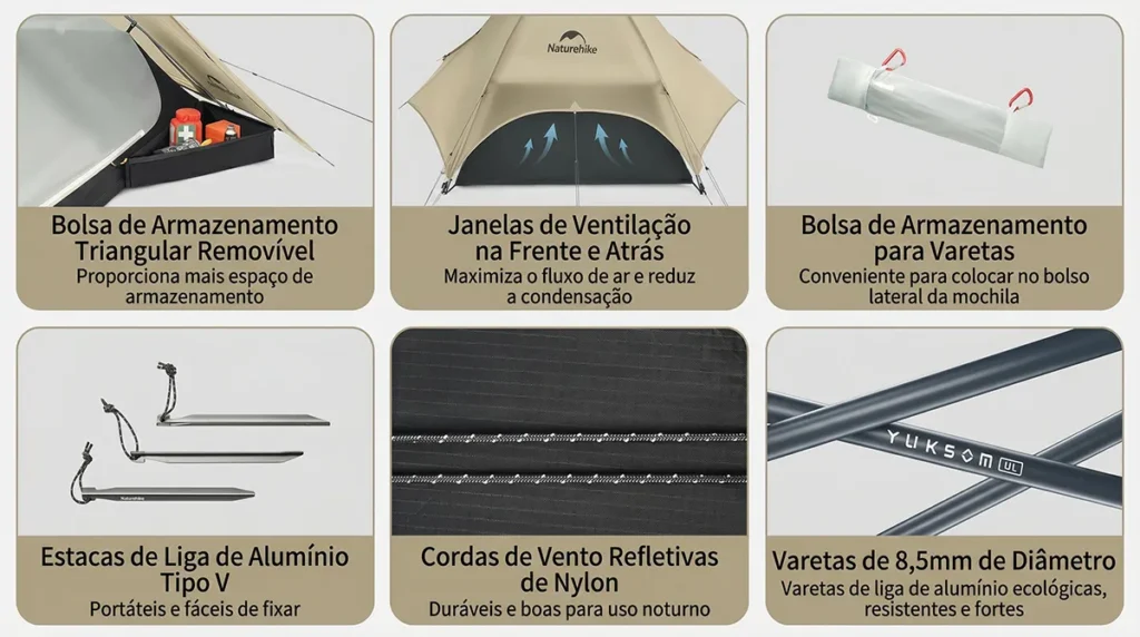 - Conectores de Precisão: O hub central em “Y” é o ponto de maior tensão. A análise técnica indica que a Naturehike reforçou essa peça para evitar a quebra por torção, um problema comum em modelos genéricos de baixo custo.